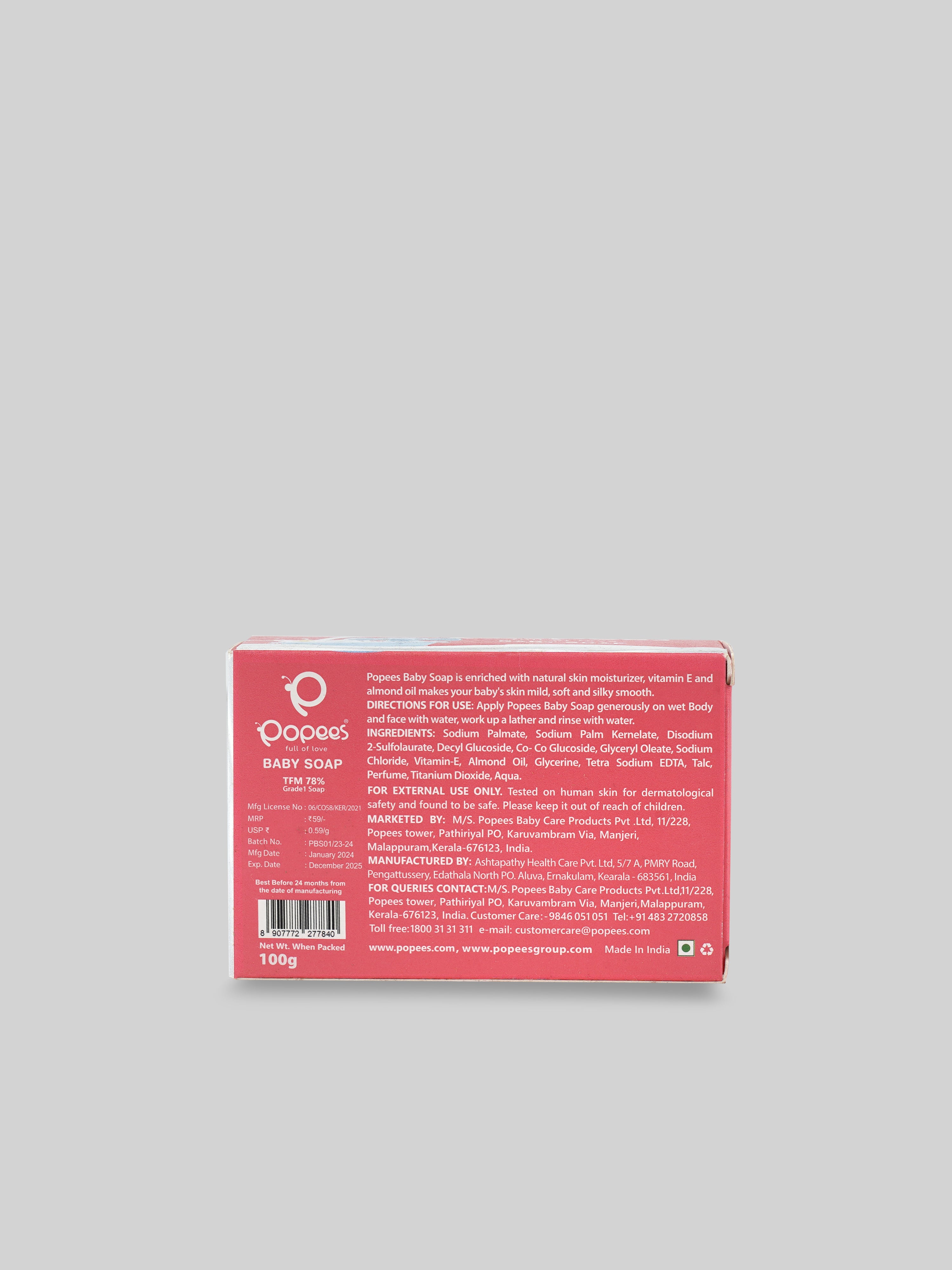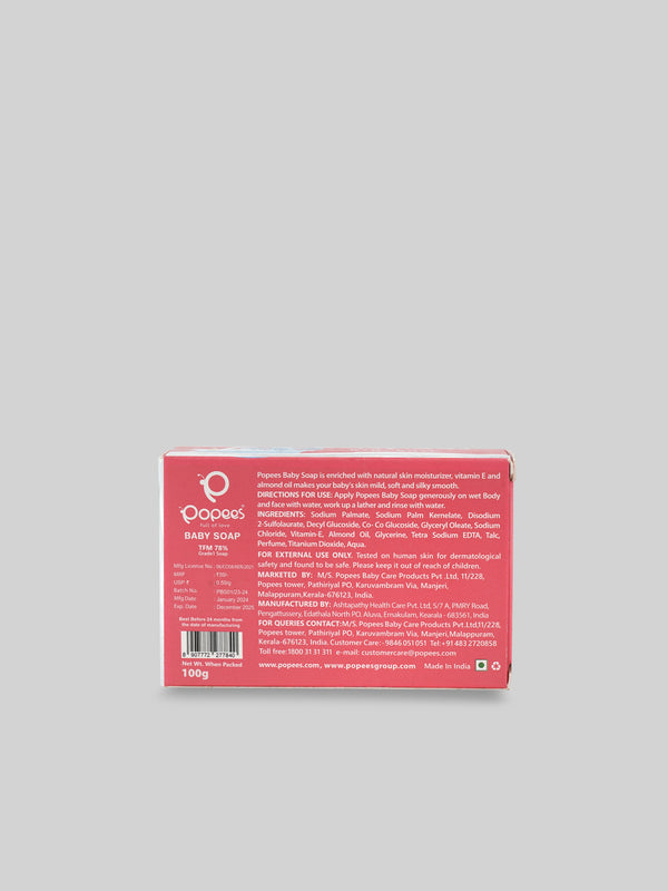 Popees Grade 1 baby soap, with 78% Total Fatty Matter (TFM), is enriched with natural skin moisturizing agents and almond oil. This gentle formula provides deep nourishment and helps maintain the skin’s softness and hydration. Specially designed for sensitive baby skin, it offers a soothing cleanse while protecting the skin’s natural moisture balance, making it ideal for daily use on newborns and infants.