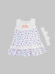 This adorable white dress is made with premium Woven Schiffli material known for its elegant eyelet detailing and breathable comfort. With its gathered silhouette and natural wooden buttons, it offers both style and ease for your little one.