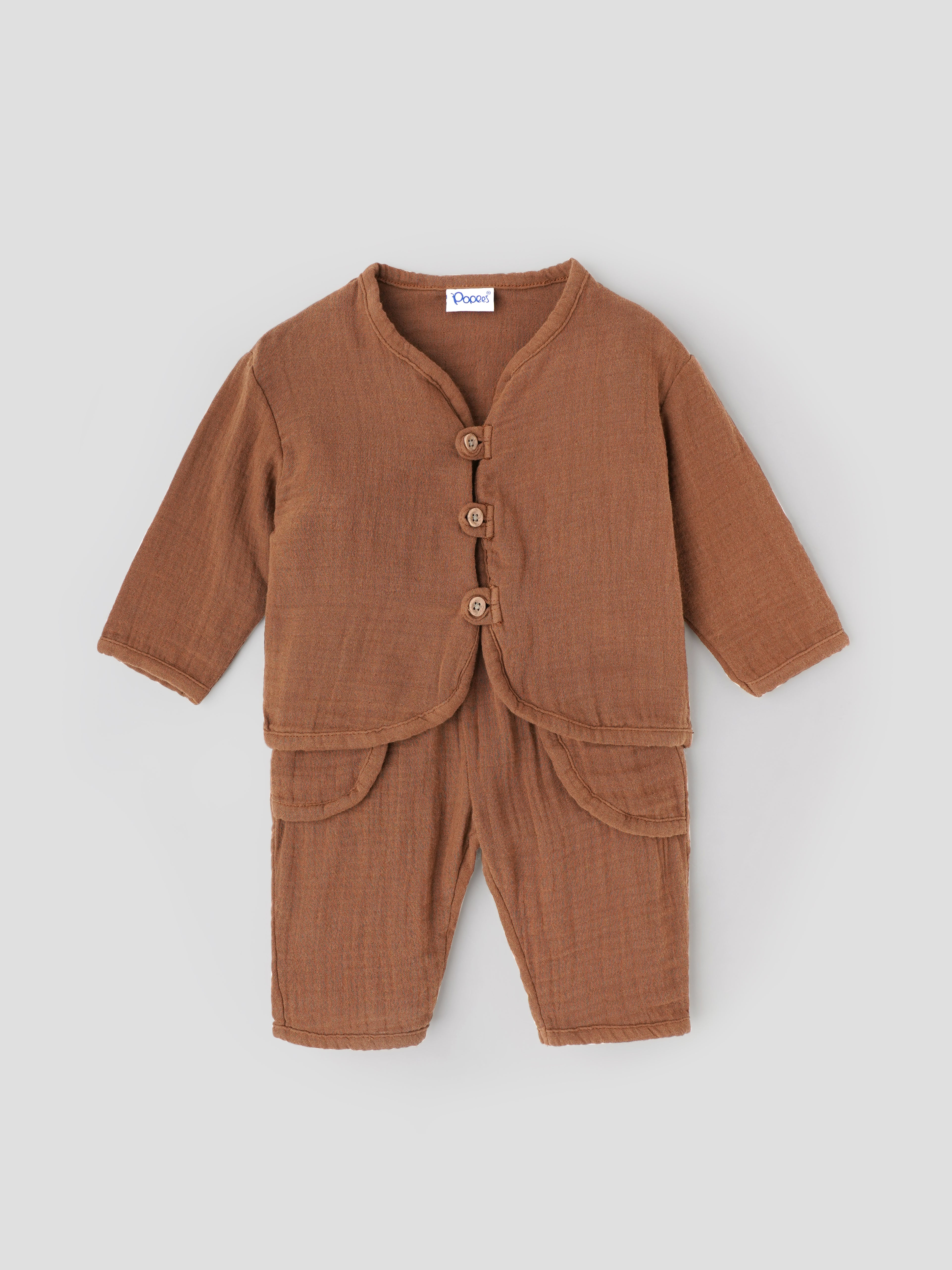 This fashionable top and bottom coordinated set is the perfect outfit for your little trendsetter. Crafted with soft and breathable woven fabric, it ensures all-day comfort. The brown colour adds a touch of elegance, while the design keeps your baby cool. The front open design makes it easy to dress and undress. This coordinated set is available in sizes 3 to 36 months, ensuring a perfect fit for your growing baby.