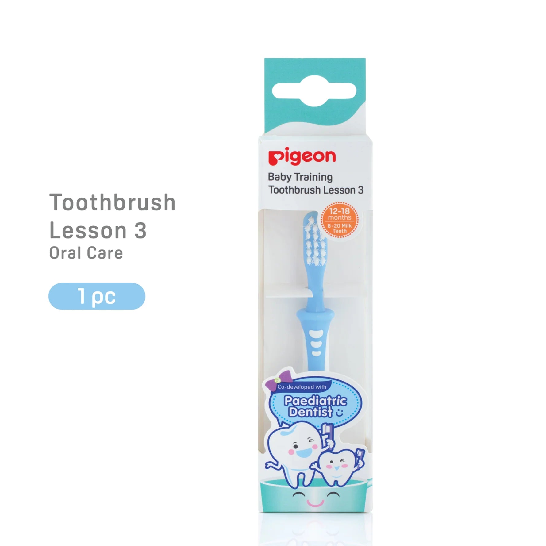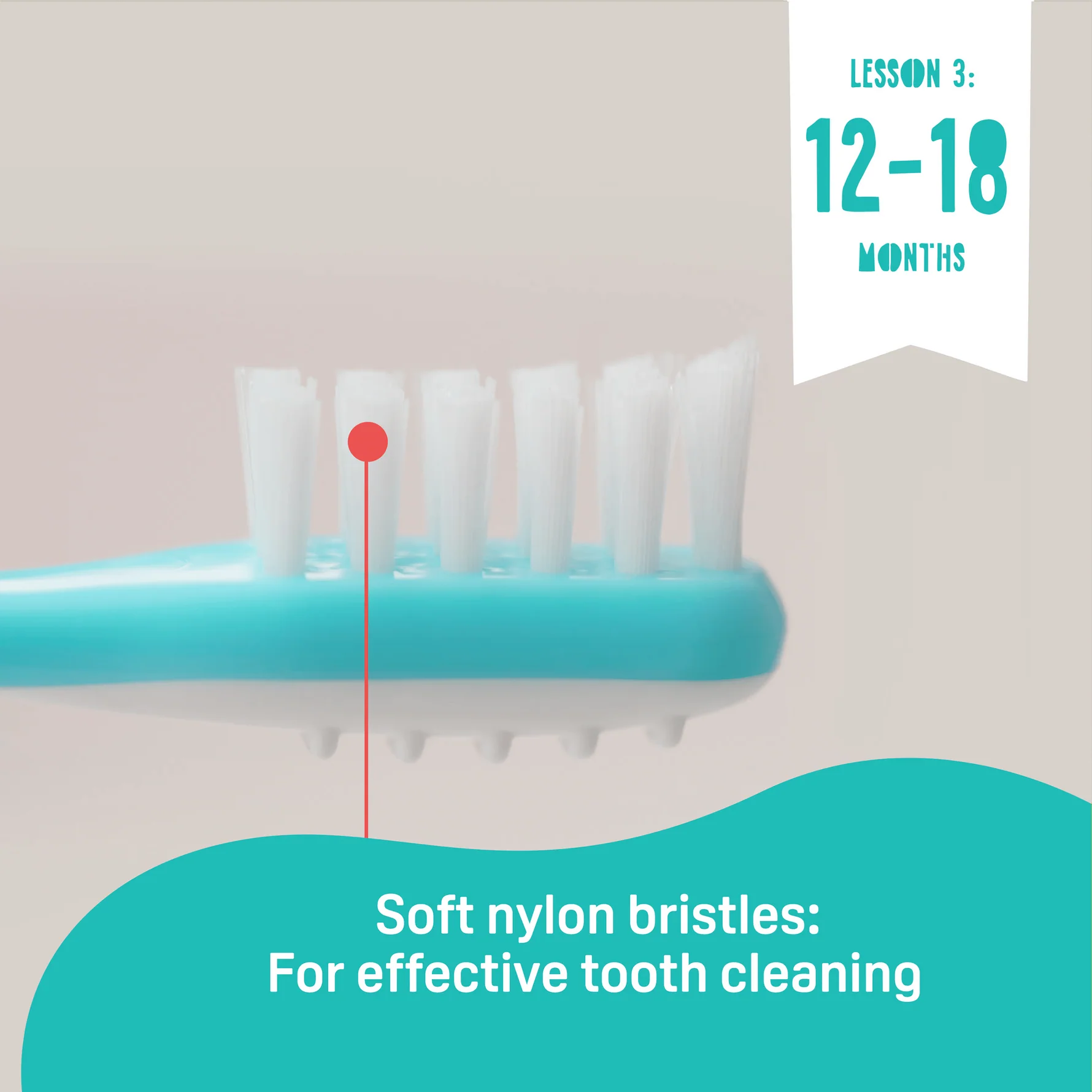 The Baby Training Toothbrush, co-developed with a leading paediatric dentist, is designed for 12-18 month-olds or when most milk teeth are developed. This 1 Year Baby Toothbrush features Lesson 3 with a curved grip and fine nylon bristles for gentle cleaning, alongside a soft-grip handle for ease of use, ensuring a comfortable and effective brushing experience for little ones.
