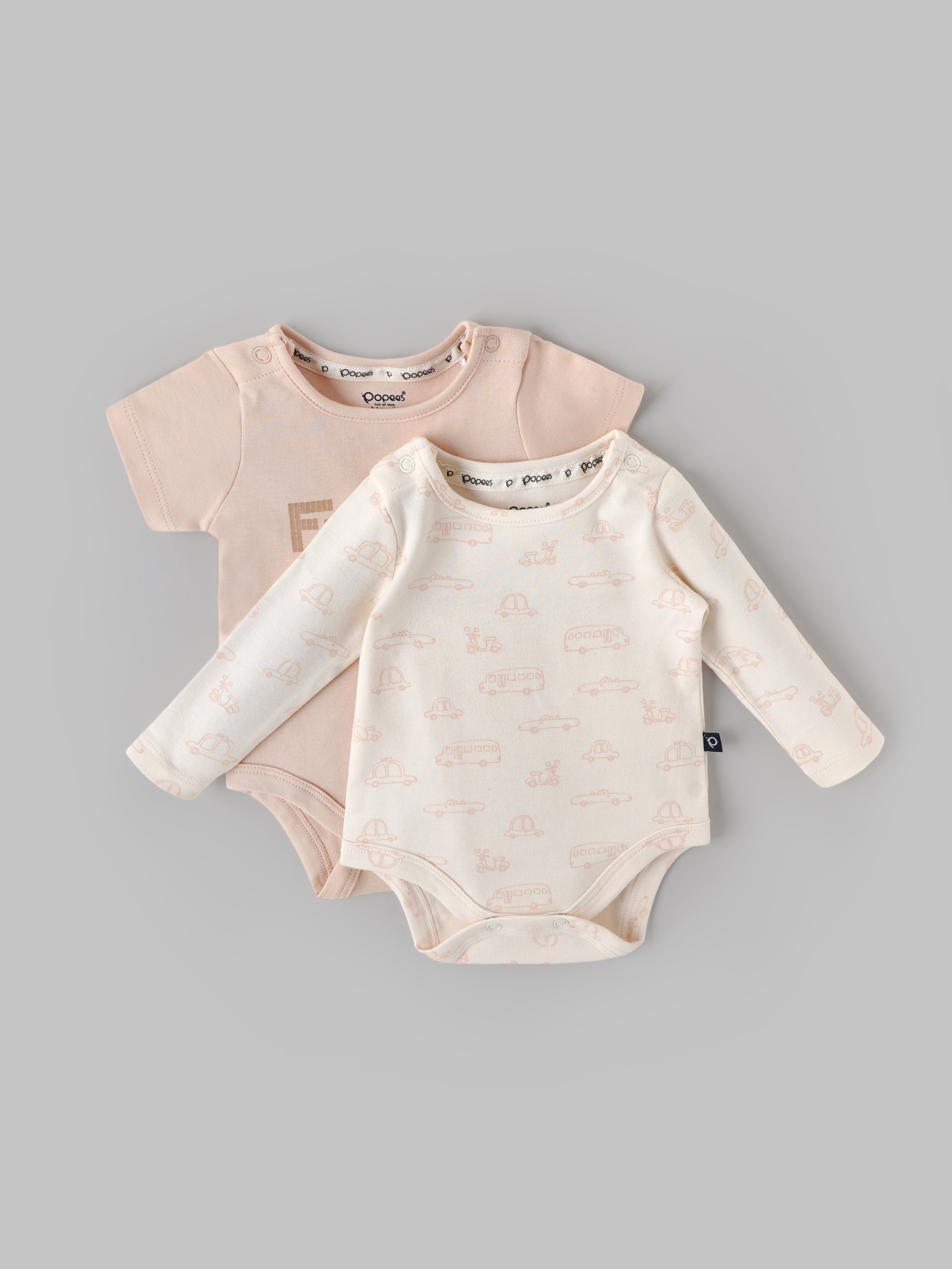 Popees Baby Boys Bodysuit Set (Pack of 2) is designed to keep your little one comfortable and stylish all day long. Made from soft and breathable cotton interlock fabric, these bodysuits feel gentle on delicate skin and provide lasting comfort. The set includes one solid peach bodysuit with a cute “Fun Day” text print and one cream bodysuit featuring an all-over vehicle print for a playful look. Designed with convenient shoulder snap buttons and bottom press buttons, dressing and diaper changes become quick and easy. With one short sleeve and one full sleeve option, this versatile set is perfect for daily wear, layering, playtime, or bedtime.