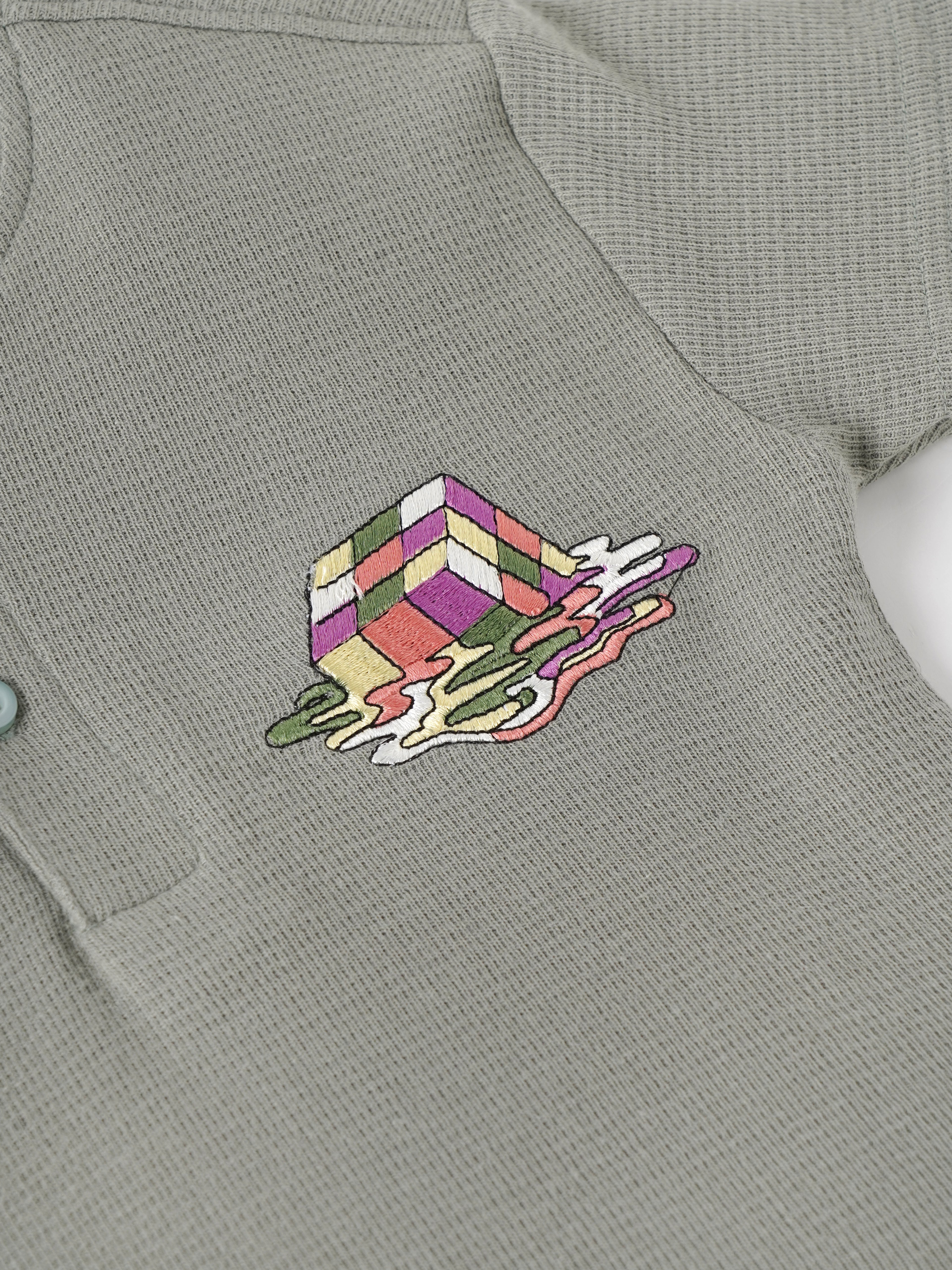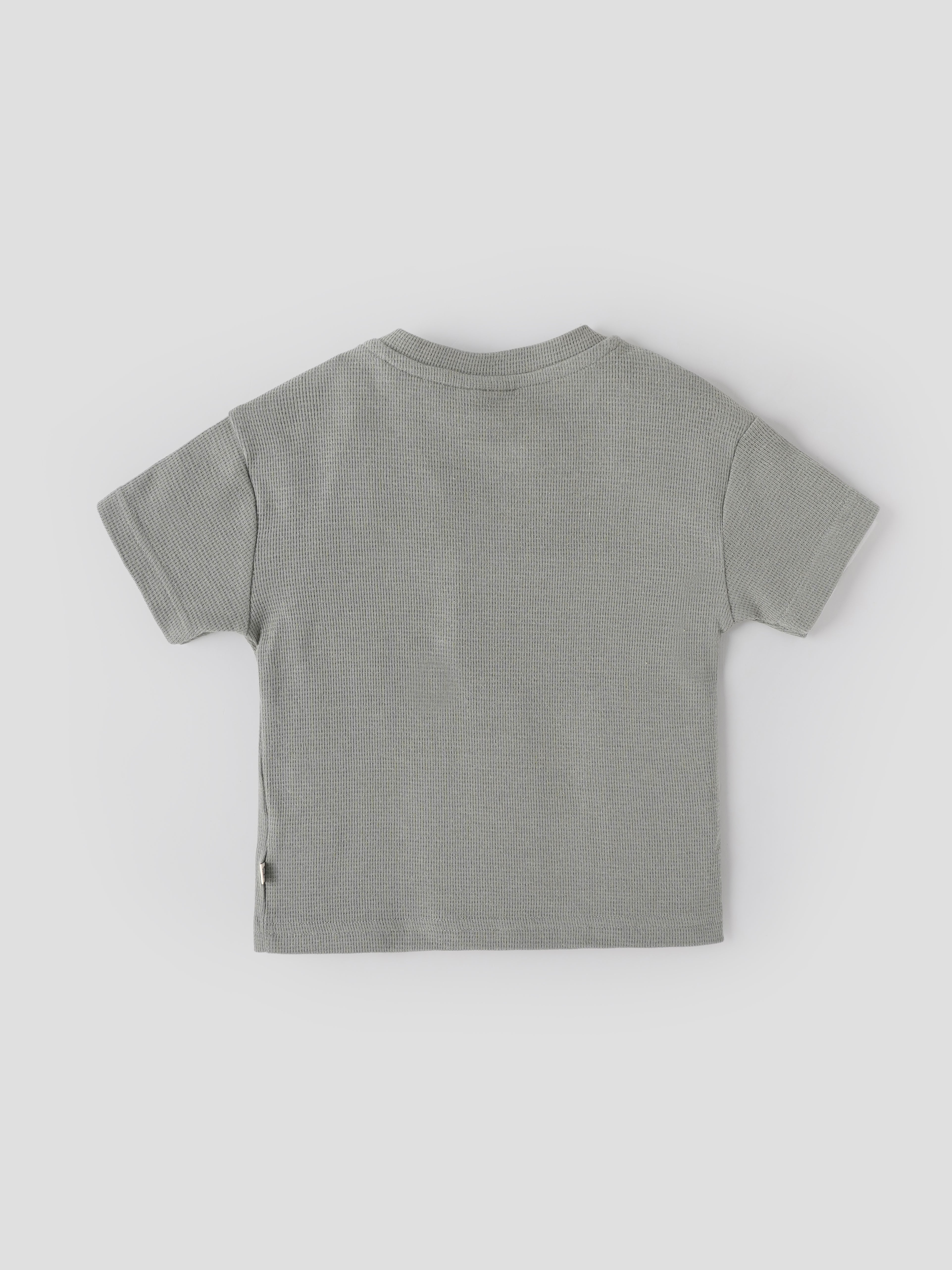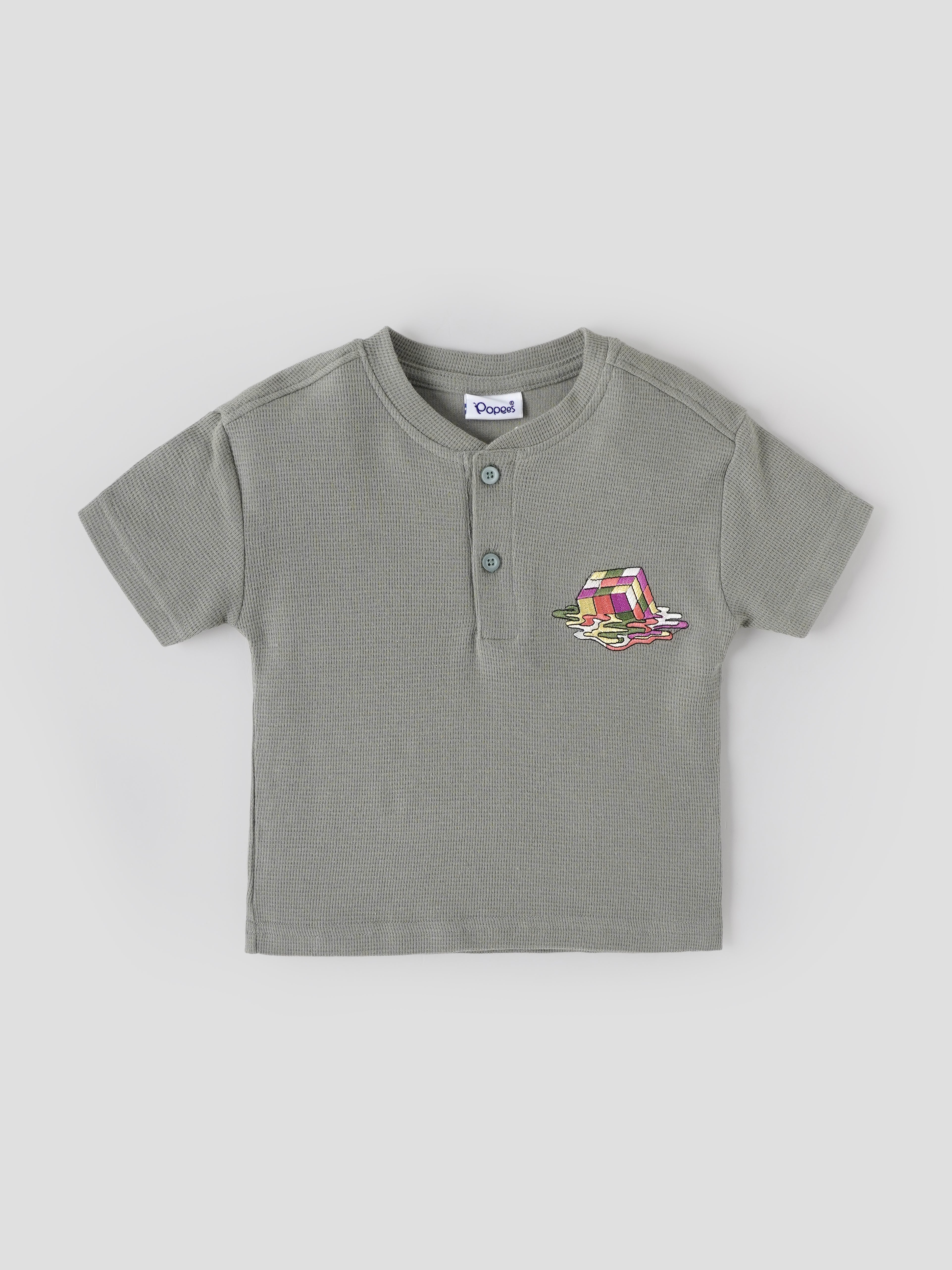 Popees Baby Boys Textured T-Shirt is crafted from soft, breathable waffle-knit cotton to keep your little one comfortable throughout the day. Designed in a trendy sage green shade, it features a stylish multicolor embroidered cube patch on the chest for a fun and modern touch. The Henley-style round neck with a two-button placket allows easy dressing, while the short sleeves and lightweight fabric make it perfect for warm weather. Ideal for daily wear, playtime, and casual outings.