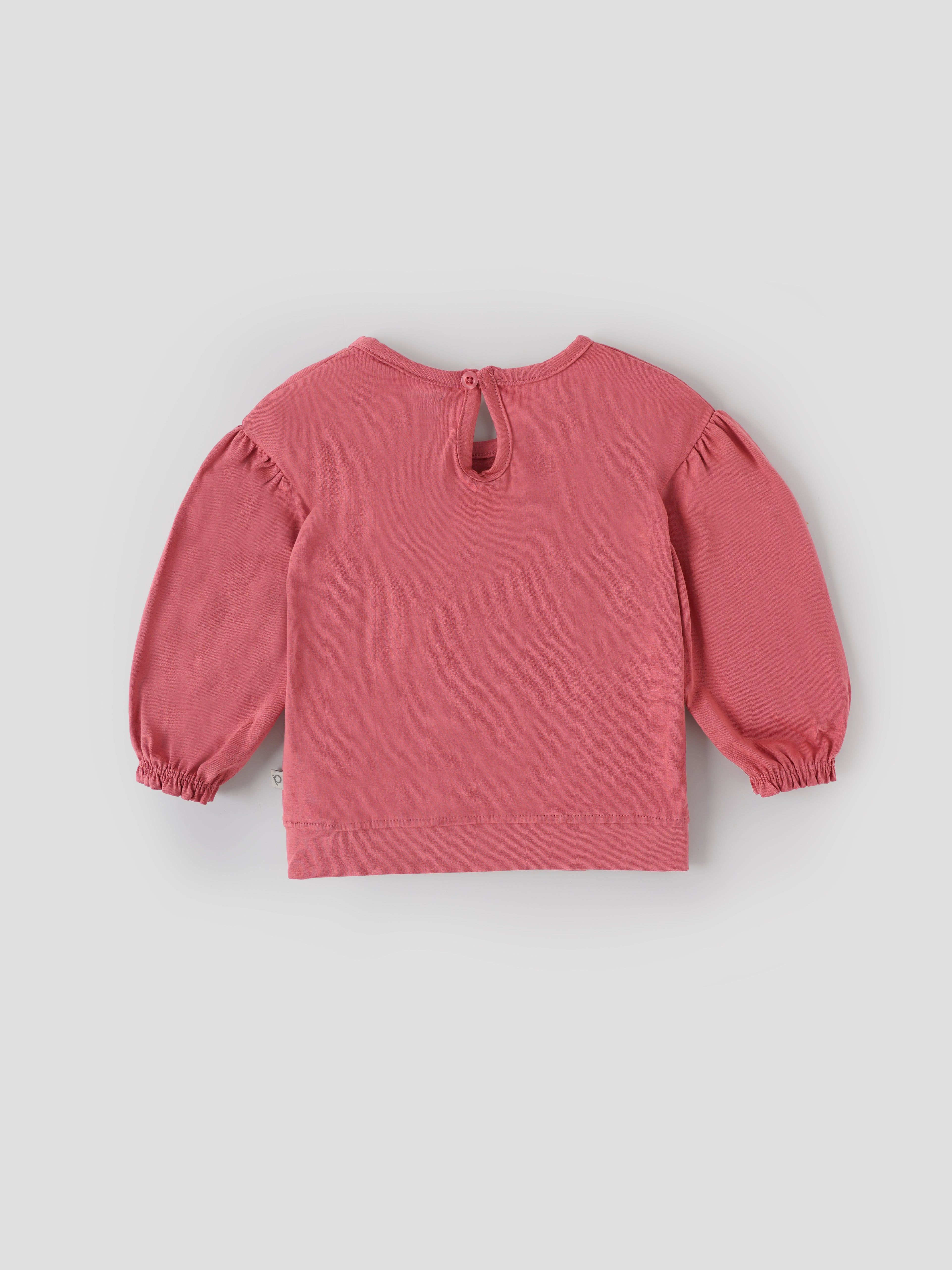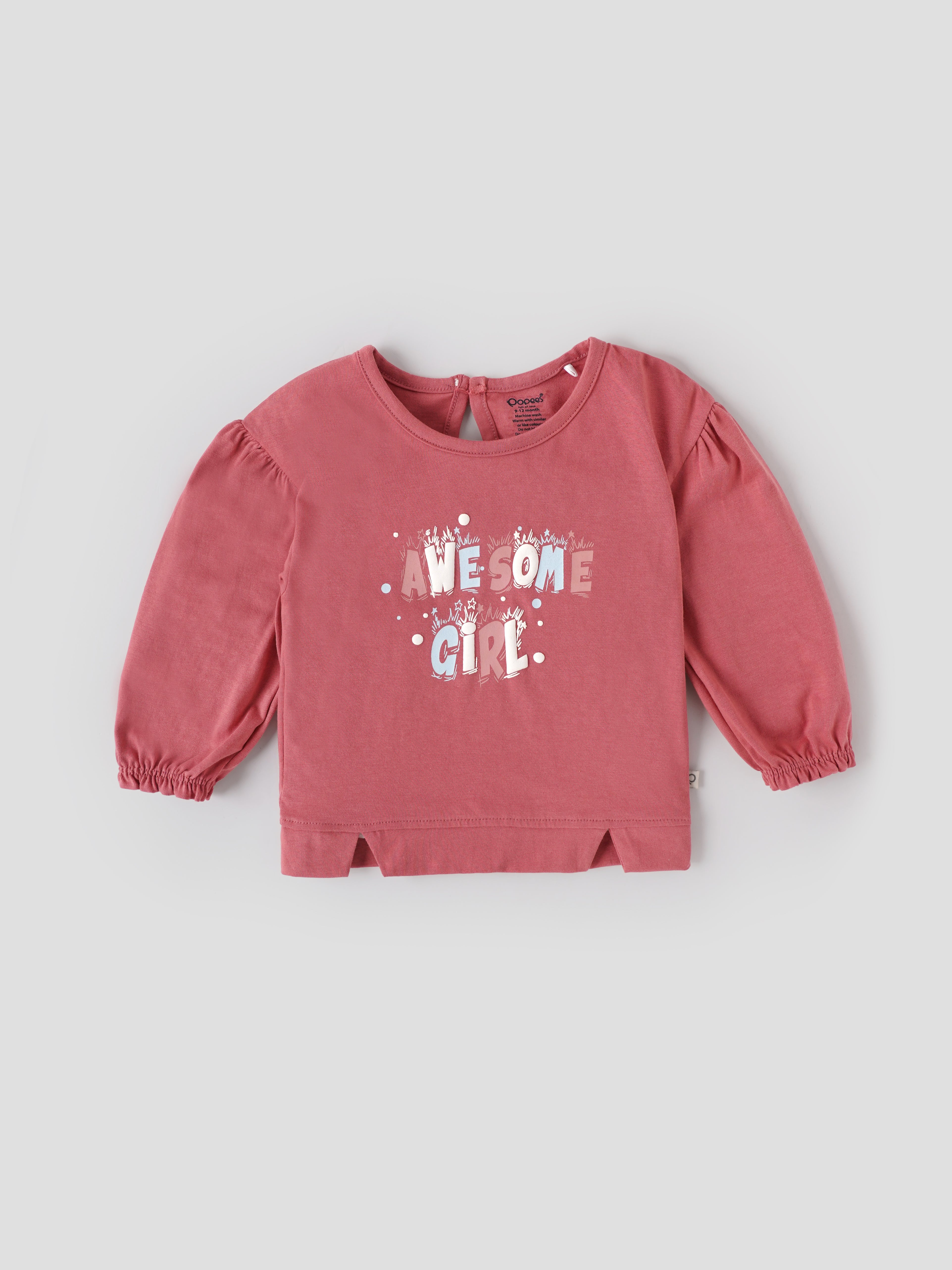 Popees Baby Girls Full Sleeve T-Shirt is made from soft, breathable cotton knit to keep your little one comfortable all day long. Designed in a beautiful coral pink shade, it features a cute “Awesome Girl” front graphic with playful star details for an adorable look. The round neck and back button keyhole closure make dressing easy, while the full sleeves with elasticated cuffs ensure a snug and cozy fit. Perfect for daily wear, playtime, and casual outings. Available in sizes 9 Months to 4 Years.