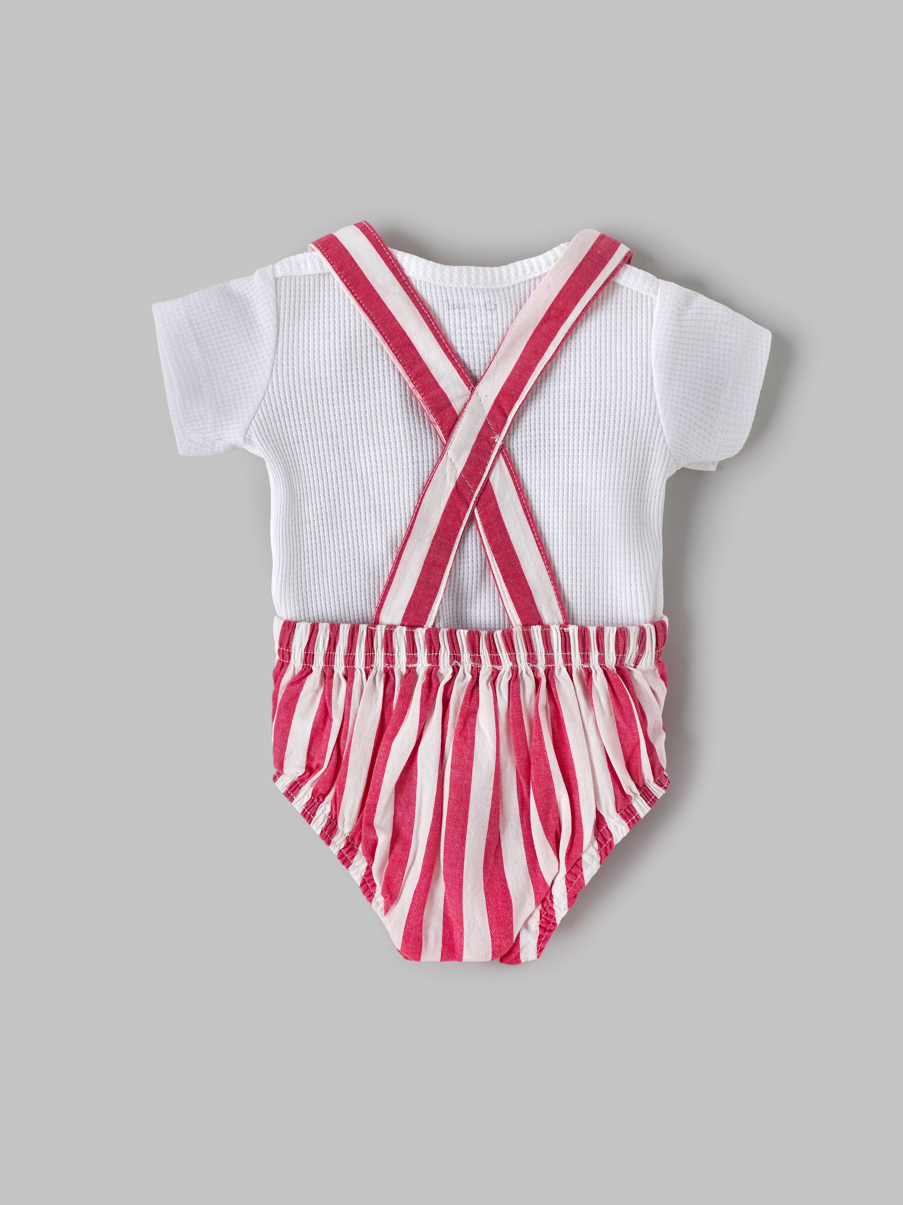 Dress your little one in Popees festive charm with this adorable dungaree romper set. Featuring a soft white short-sleeve tee layered under a deep red overall romper, this outfit is decorated with delicate snowflakes, stars, and winter motifs for a cozy seasonal look. Designed with adjustable shoulder buttons, a cute front pocket, and snap closures at the bottom, it makes dressing and diaper changes quick and easy. Crafted from gentle, breathable fabric, it’s perfect for keeping your baby comfy and stylish during everyday wear or special holiday moments.
