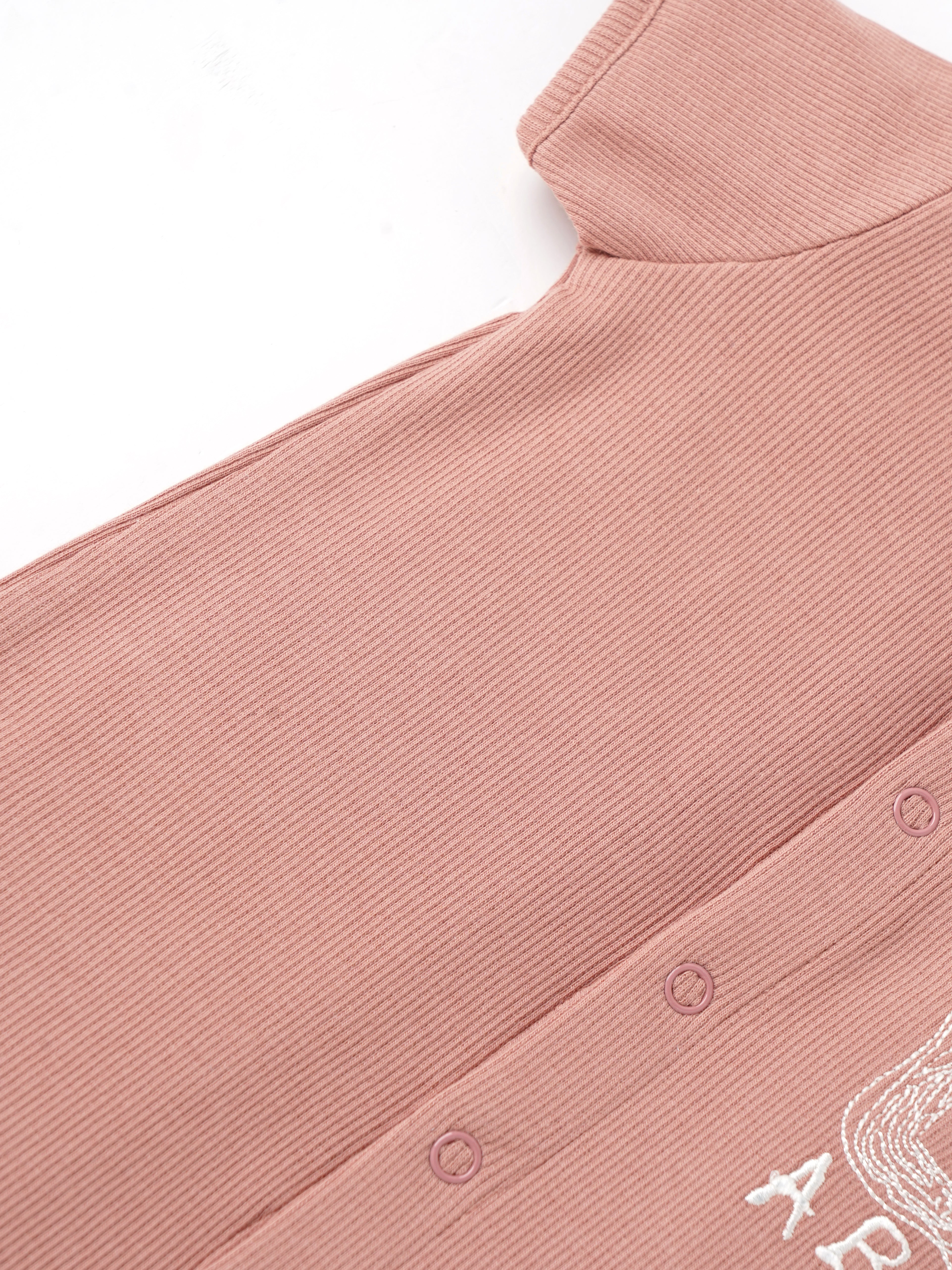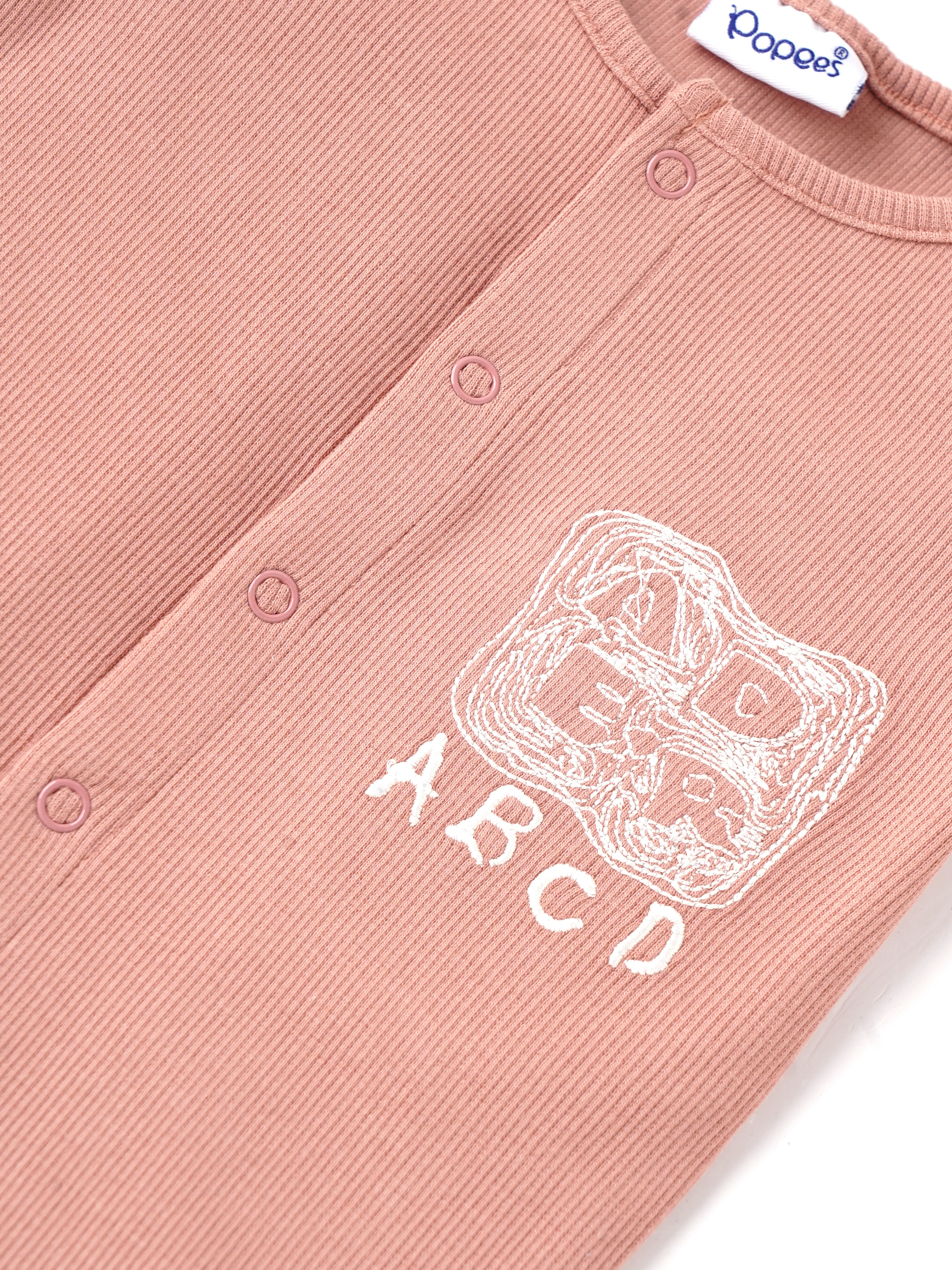 Popees baby boys romper is designed for everyday comfort with a clean and minimal look. Made from soft ribbed cotton, it provides excellent breathability and flexibility for active babies. The front snap button closure ensures easy dressing and quick diaper changes, while the subtle ABC print adds a playful touch. Lightweight and gentle on the skin, this romper is perfect for keeping your baby comfortable throughout the day.